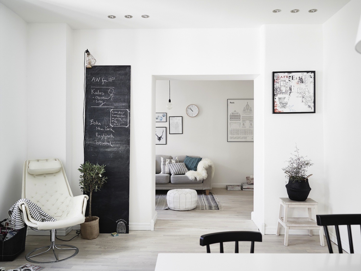 Ohne viel Schnörkel präsentiert sich dieses schwedische Wohnzimmer und ist für uns eine perfekte Wohninspiration. Der gesamte Raum ist überwiegend weiß gehalten. Durch schwarze und graue Möbel sowie Einrichtungsgegenstände und Wohnaccessoires wird gekonnt ein Kontrast geschaffen. Der Raum wirkt wohnlich, luftig und einfach nur schön.